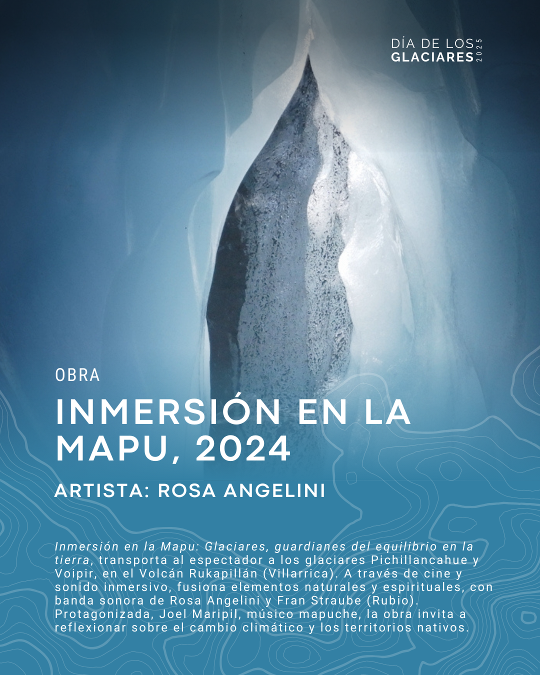 Inmersión en la Mapu: “Glaciares, Guardianes del Equilibrio en la Tierra” (2024) fue parte del Día de los Glaciares en el marco del Año Internacional por la Conservación de los Glaciares. El 21 de marzo 2025 se exhibe el Episodio III de Inmersión en la Mapu: “Glaciares, Guardianes del Equilibrio en la Tierra” (2024) en el Centro Cultural La Moneda, a partir de las 18:00 hrs a modo rotativo en el marco de la inauguración de esta celebración.